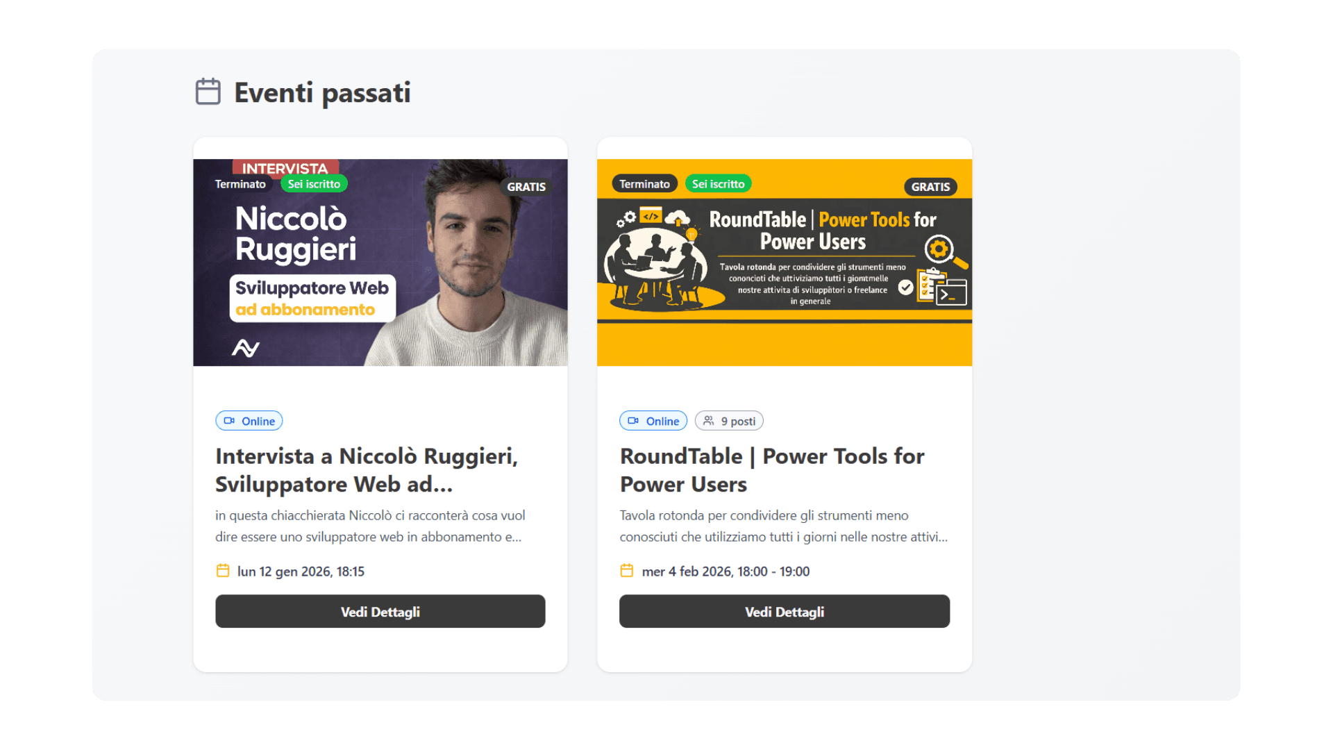 Con Developerway hai accesso a Workshop tecnici e sul mondo del freelancing per diventare un freelance migliore non solo nelle skills, ma anche nella gestione.
