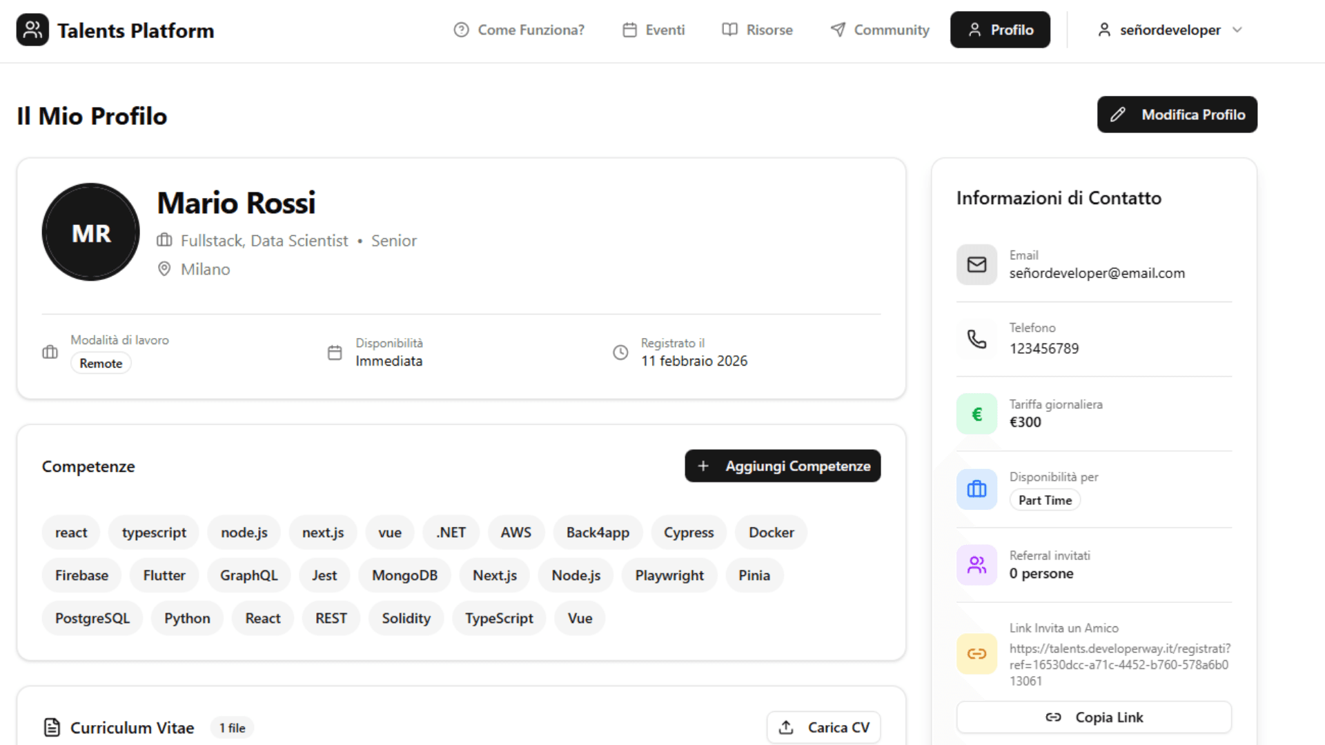 Il DeveloperWay Talents Network è una piattaforma dedicata ai developer freelance che vogliono lavorare su progetti di qualità, senza perdere tempo in mille colloqui inutili o piattaforme generaliste.